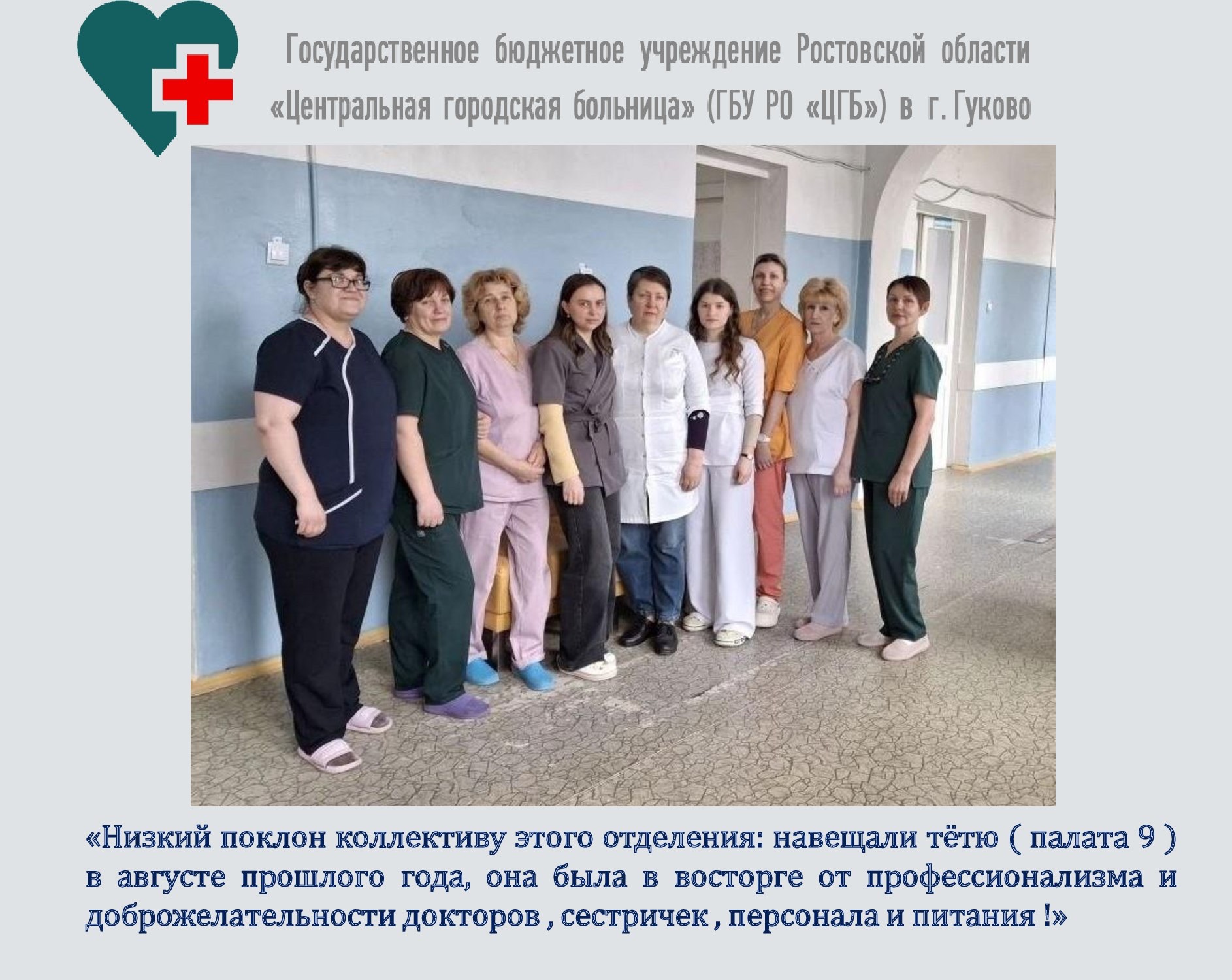 Приветствуем вас на сайте государственного бюджетного учреждения Ростовской области (ГБУ РО) «Центральная городская больница» в г. Гуково! На этом информационном ресурсе вы можете получить подробную информацию об учреждении здравоохранения ГБУ РО «ЦГБ» в г. Гуково, о расписании работы врачей, о контактных телефонах и адресах поликлинических отделений и стационаров, другие сведения.