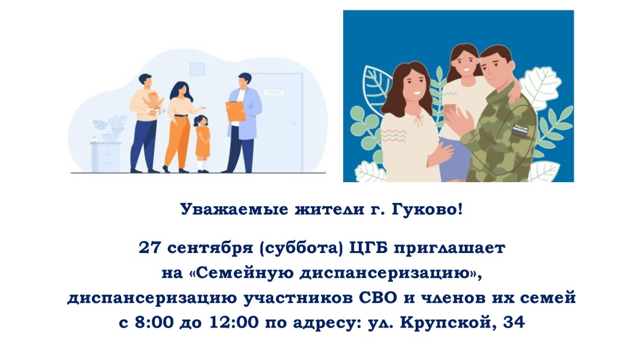 Уважаемые пациенты!!! ГБУ РО «ЦГБ» в г.Гуково приглашает жителей 27 сентября с 8:00 до 12:00 по адресу: ул.Крупской, 34 на «Семейную диспансеризацию» и диспансеризацию участников СВО, членов их семей и вдов участников СВО В этот день вы сможете бесплатно: ✅ сдать кровь на глюкозу и холестерин ✅ измерить давление ✅ пройти ЭКГ и флюорограмму ✅ женщины маммограмму, попасть на приём к гинекологу В нашей поликлинике мы стремимся сделать процесс диспансеризации удобным и доступным для всех! Не откладывайте заботу о здоровье на потом!!! Приходите 27 сентября в поликлиническое отделение №2 по адресу: ул. Крупской, 34 всей семьёй и пройдите диспансеризацию вместе! #Диспансеризация#ЦГБГуково#Профилактика